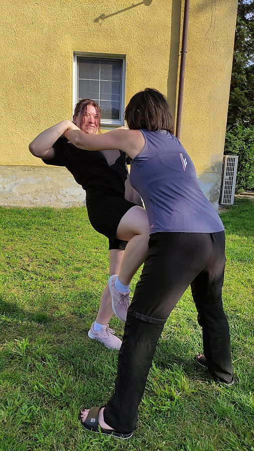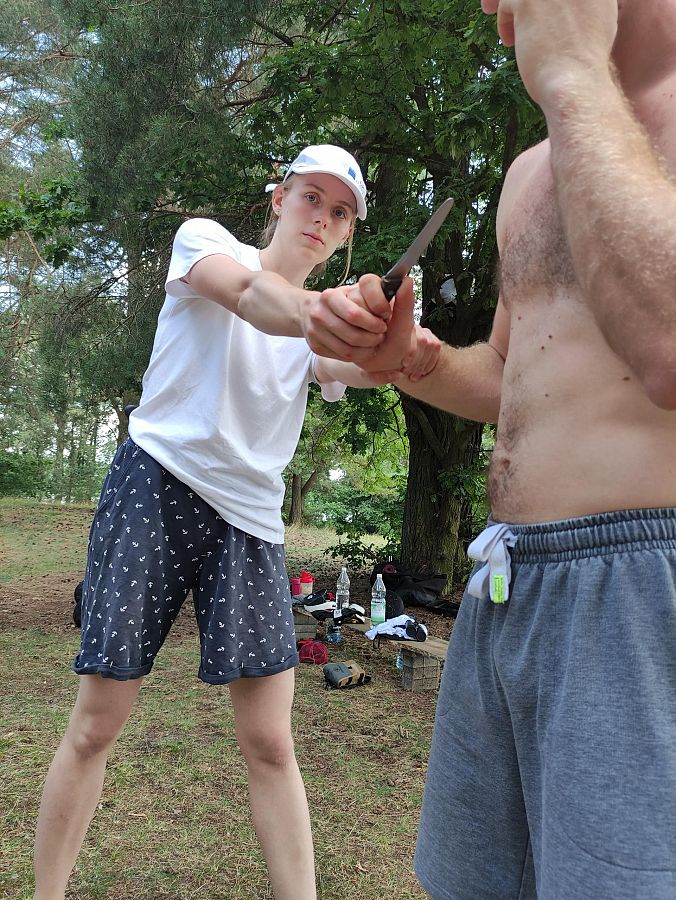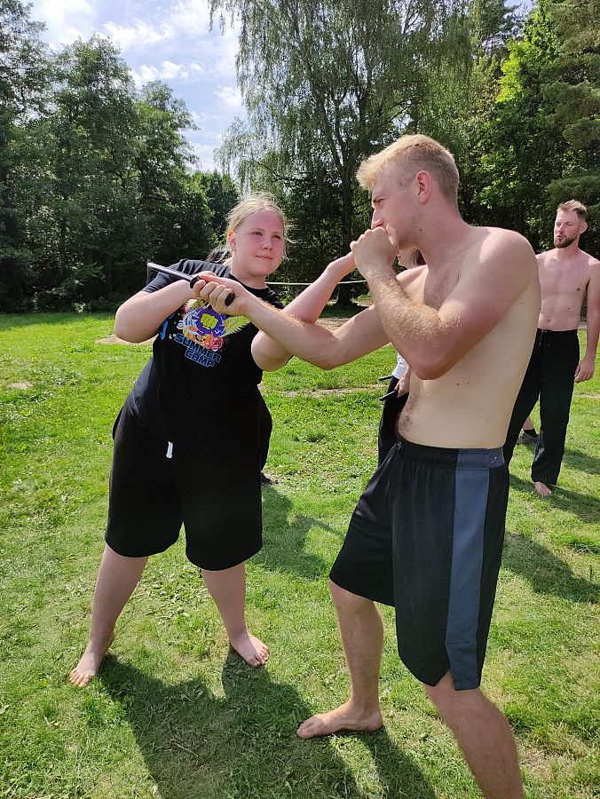 Główną osią obozu były jednak treningi. Codziennie spędzaliśmy kilka godzin na łące lub w lesie, łącząc treningi techniczne z zajęciami fightowymi. Skupiliśmy się na najważniejszym temacie tego roku – samoobronie w sytuacji ataku nożem. To właśnie nóż, jako najczęściej wykorzystywane narzędzie agresorów przy napadach czy szantażach stanowił centrum naszych zajęć. Uczestnicy poznawali techniki obrony, scenariusze realistycznych ataków oraz uczyli się reagować szybko i zdecydowanie. Ogromna dawka wiedzy, która może przydać się w codziennym życiu i jeszcze więcej praktyki, bo tylko ćwiczenie czyni mistrza.